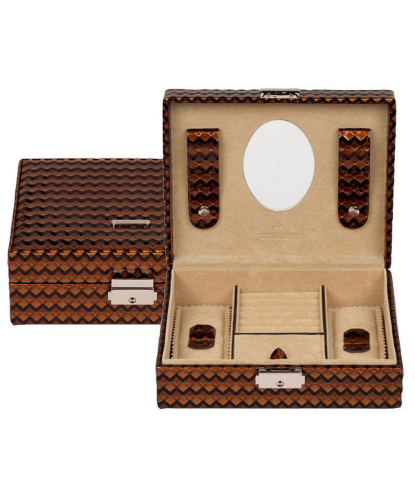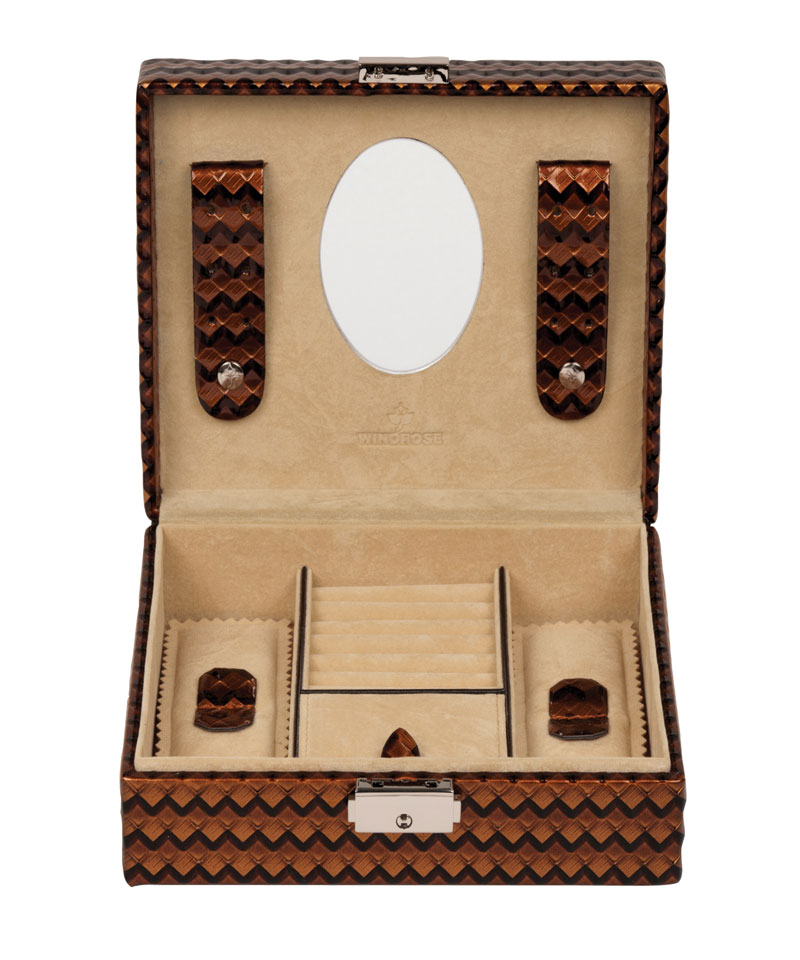Caseta este îmbrăcată în piele ecologică cu efect 3D, atunci când se deschide, caseta îţi dezvăluie spaţii suficiente pentru păstrarea bijuteriilor: 4 mini-compartimente, din care unul pentru inele. Capacul este prevăzut cu o oglindă şi 2 panglici pentru cercei, care se închid prin capsă. Interiorul este căptuşit de o catifea bej, pentru protejarea bijuteriilor în condiţii optime. Caseta este prevăzută şi cu un lacăt, foarte necesar mai ales în călătorii.