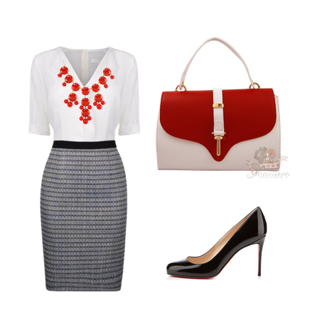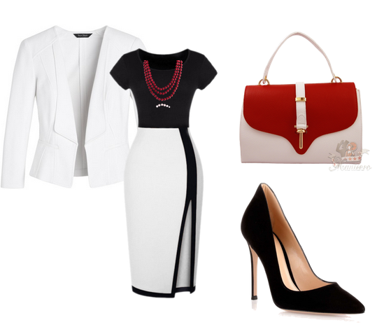 Ţinută office – o ţinută simplă de serviciu, alb cu negru, are nevoie de o pată de culoare. De exemplu o geantă roşie, sau în acest caz alb cu roşu, asortată la un colier sau alt accesoriu roşu. Poate fi şi o curea roşie, o brăţară sau nişte cercei mici.