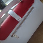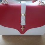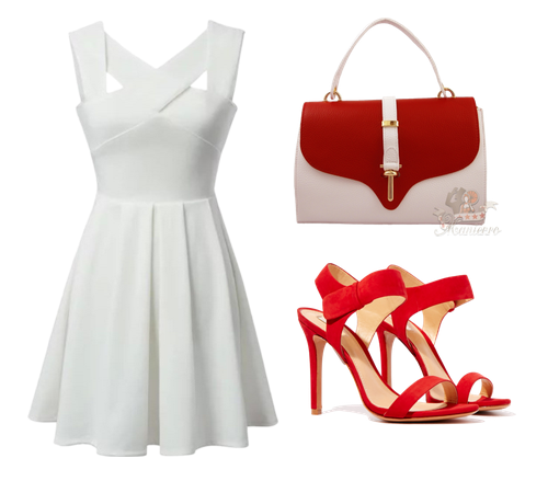 Ţinută elegantă, de zi – perfectă pentru un eveniment ce se desfăşoară ziua. De exemplu participarea la o cununie civilă sau o zi de naştere sărbătorită la prânz, la restaurant. Geanta însoţeşte frumos o rochie albă, ca spuma laptelui, şi nişte pantofi roşii. O ţinută elegantă, feminină, îndrăzneaţă.